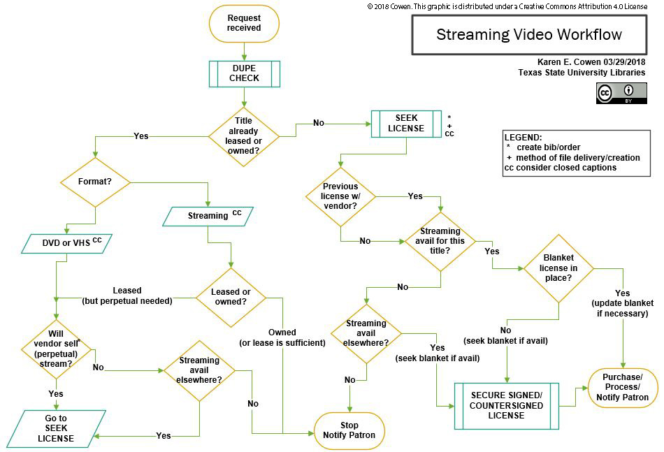 This paper documents the results of a three-year process at a university library to develop a workflow for acquiring streaming video for use in face-to-face, hybrid, and online courses. The authors of this paper created two tools that guide their library in acquiring streaming video: the Streaming Resources Decision Tree (SRDT) and the Streaming Video Workflow Chart (SVWC). This paper describes the SRDT in depth, and the SVWC in brief. This paper describes the legal rationale behind the SRDT, which explores the limits of the right to fair use in U.S. copyright law.