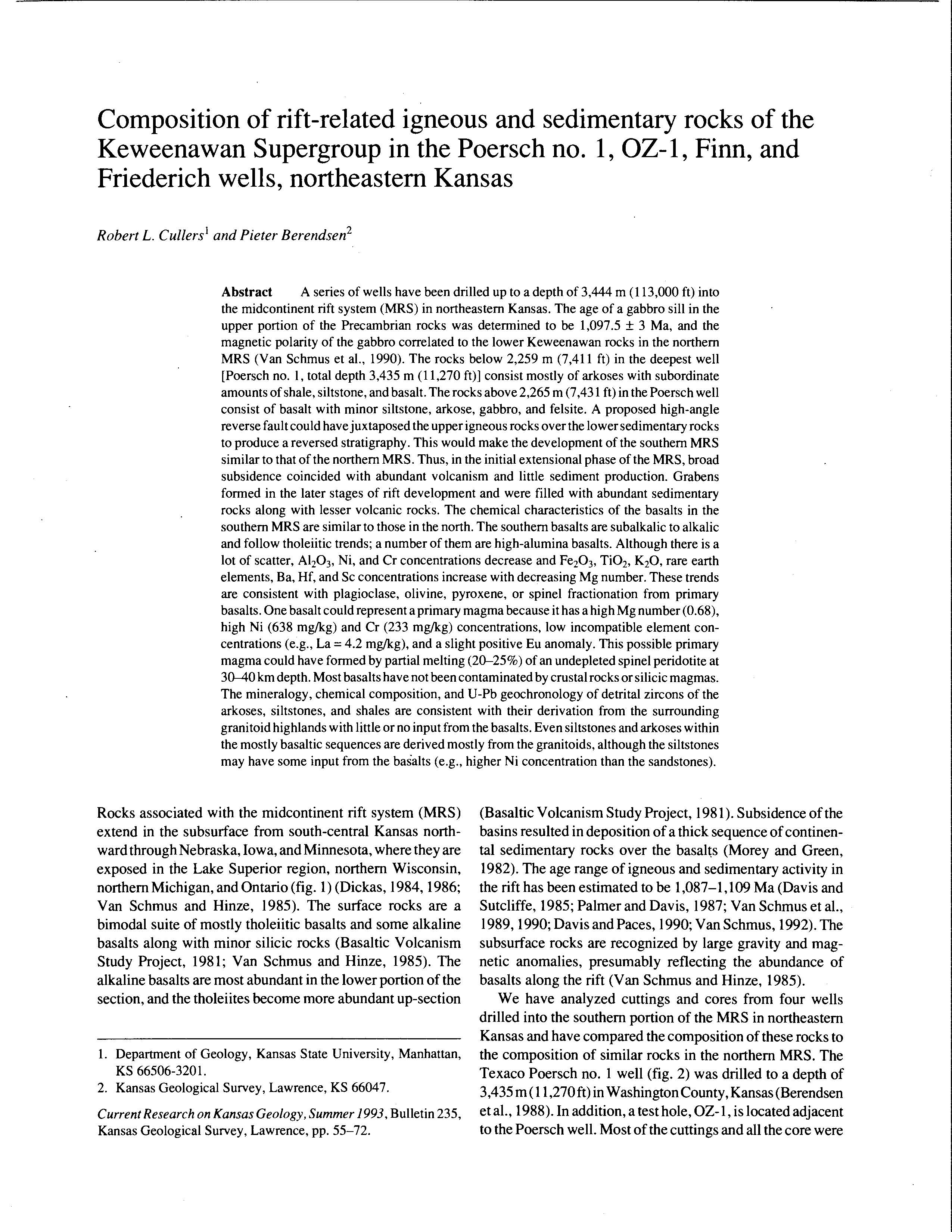 A series of wells have been drilled up to a depth of 3,444 m (113,000 ft) into the midcontinent rift system (MRS) in northeastern Kansas. The age of a gabbro sill in the upper portion of the Precambrian rocks was determined to be 1,097.5 ± 3 Ma, and the magnetic polarity of the gabbro correlated to the lower Keweenawan rocks in the northern MRS (Van Schmus et al., 1990). The rocks below 2,259 m (7,411 ft) in the deepest well [Poersch no. 1, total depth 3,435 m (11,270 ft)] consist mostly of arkoses with subordinate amounts of shale, siltstone, and basalt. The rocks above 2,265 m (7,431 ft) in the Poersch well consist of basalt with minor siltstone, arkose, gabbro, and felsite. A proposed high-angle reverse fault could have juxtaposed the upper igneous rocks over the lower sedimentary rocks to produce a reversed stratigraphy. This would make the development of the southern MRS similar to that of the northern MRS. Thus, in the initial extensional phase of the MRS, broad subsidence coincided with abundant volcanism and little sediment production. Grabens formed in the later stages of rift development and were filled with abundant sedimentary rocks along with lesser volcanic rocks. The chemical characteristics of the basalts in the southern MRS are similar to those in the north. The southern basalts are subalkalic to alkalic and follow tholeiitic trends; a number of them are high-alumina basalts. Although there is a lot of scatter, Al2O3, Ni, and Cr concentrations decrease and Fe2O3, TiO2, K2O, rare earth elements, Ba, Hf, and Sc concentrations increase with decreasing Mg number. These trends are consistent with plagioclase, olivine, pyroxene, or spinel fractionation from primary basalts. One basalt could represent a primary magma because it has a high Mg number (0.68), high Ni (638 mg/kg) and Cr (233 mg/kg) concentrations, low incompatible element concentrations (e.g., La = 4.2 mg/kg), and a slight positive Eu anomaly. This possible primary magma could have formed by partial melting (20-25%) of an undepleted spinel peridotite at 30-40 km depth. Most basalts have not been contaminated by crustal rocks or silicic magmas. The mineralogy, chemical composition, and U-Pb geochronology of detrital zircons of the arkoses, siltstones, and shales are consistent with their derivation from the surrounding granitoid highlands with little or no input from the basalts. Even siltstones and arkoses within the mostly basaltic sequences are derived mostly from the granitoids, although the siltstones may have some input from the basalts (e.g., higher Ni concentration than the sandstones).