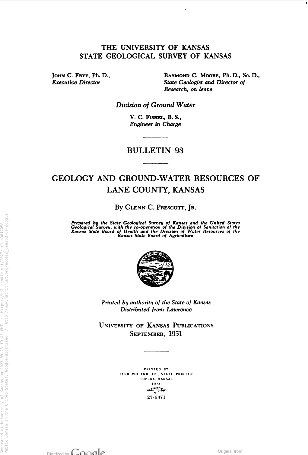 Bulletin 93: Geology and Ground-Water Resources of Lane County, Kansas